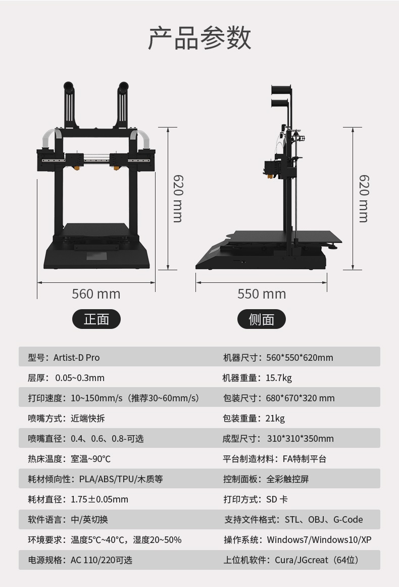 Artist-D pro雙噴頭3D打印機,采用獨立式噴頭,支持4種打印模式,采用高精度運動組件,靜音主板,支持開源。