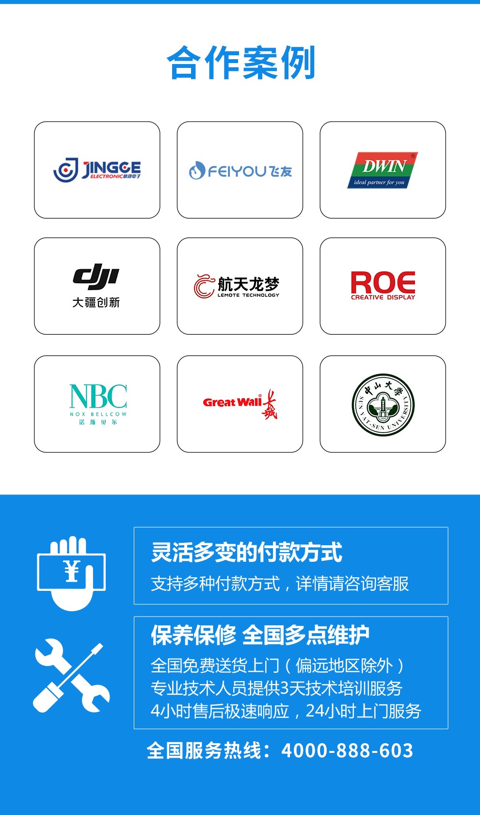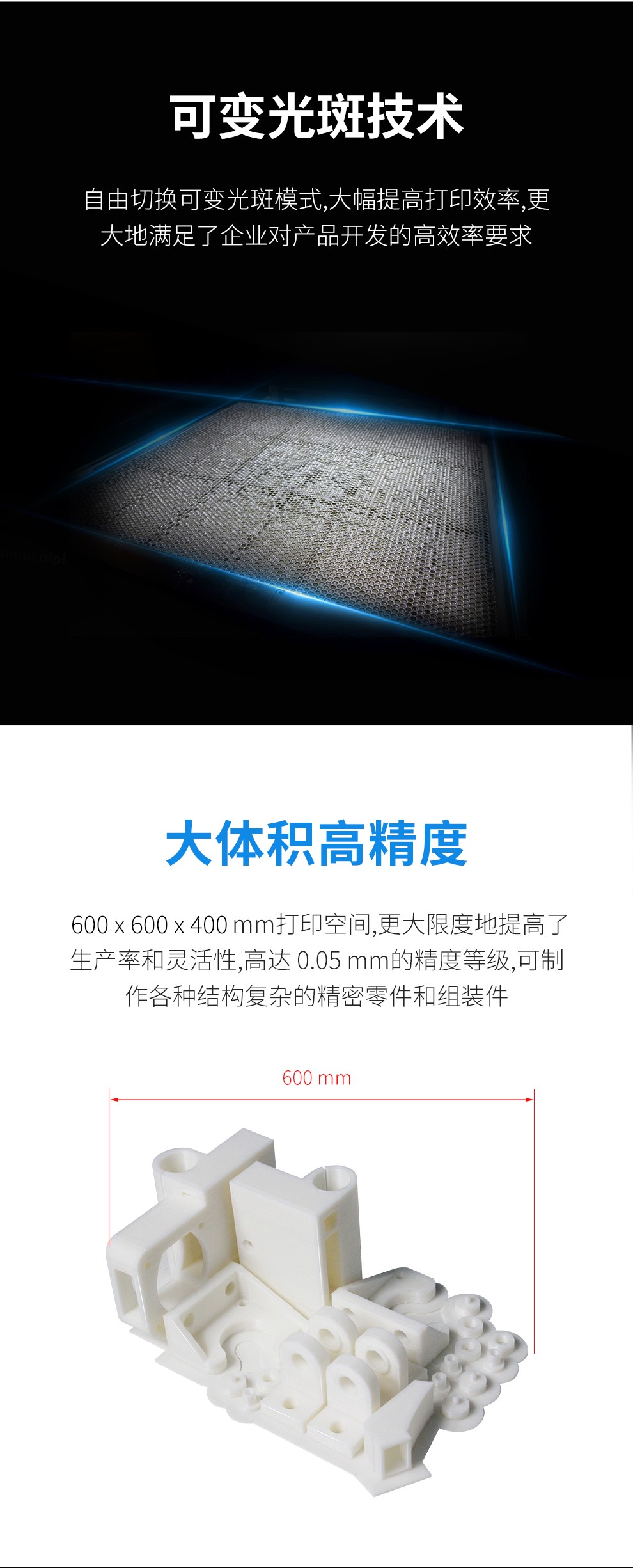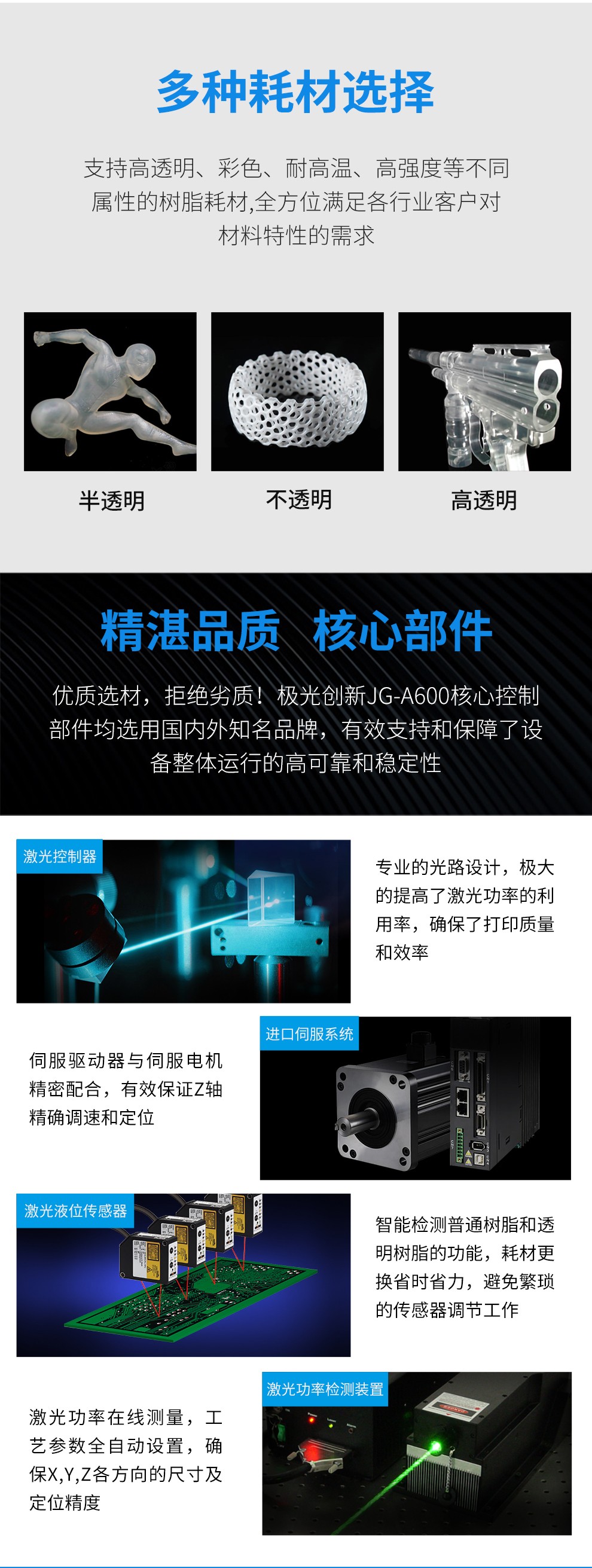 型號JG-A640,其最大成型尺寸可達600mm(X)*600mm(Y)*400mm(Z),精密制作層厚 0.1mm,極大程度的滿足了用戶對尺寸與精度需求,同時使用全固態激光器。